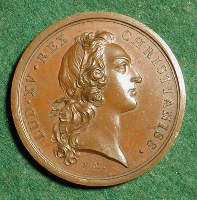 LOUIS XV: PROTECTOR OF ALSACE, CROSSING THE RHINE MARTEAU, Francois Joseph: France, 1744, Bronze, 41 mm Louis XV (1710-1774), king of France (1715-1774), was the great-grandson of Louis XIV, and the third son of Louis, Duke of Burgundy and Marie Adelaide, Princess of Savoy. Louis succeeded to the throne at the age of five, but until he reached his legal majority in1723, Philippe II, duc d'Orléans, governed as regent. In 1725 Louis married Maria Leszczynska, daughter of Stanislaw I of Poland. The following year, André Hercule de Fleury, became the chief minister, giving France a stable administration until his death 17 years later. Thereafter Louis himself was in nominal control, but he took only a sporadic interest in government and never followed any consistent policy at home or abroad. He was frequently influenced by his mistresses, the most powerful of whom was the marquise de Pompadour. Louis’ failure to provide strong leadership and badly needed reforms contributed to the crisis that brought on the French Revolution LINK to Biography of Louis XV (from Wikipedia) LINK to Portrait of Louis XV on his majority by Alexis Simon Belle (from art.com)