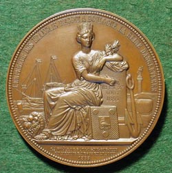61 mm In 1855 Queen Victoria of England and Prince Albert repaid the visit which the Emperor Napoleon III had earlier made to them. They arrived at Boulogne before going to Paris where they visited the World's Fair. After their voyage in France, the English sovereigns traveled by train to Boulogne for a farewell dinner given in their honor. The reception at Boulogne was the event commemorated by this medal. Charles Louis Napoleon Bonaparte (1808-1873) ( later Napoleon III) was the nephew of Emperor Napoleon I and the son of Louis Bonaparte, the brother of Napoleon I. He was the French president from 1849-1852 and emperor from 1852-1870. Napoleon III seized power in France from the short-lived Second Republic. He conducted a disastrous foreign policy, ultimately leading to the unification of Italy and more importantly to the emergence of the militarily oriented Prussians as the leading power in Germany. This resulted in the loss of Alsace-Loraine in the Franco-Prussian War and to the unification of Germany by Prussia. LINK to the Franco-Prussian War (from Bartleby.com) LINK to Biography of Napoleon III (from wikipedia) |
