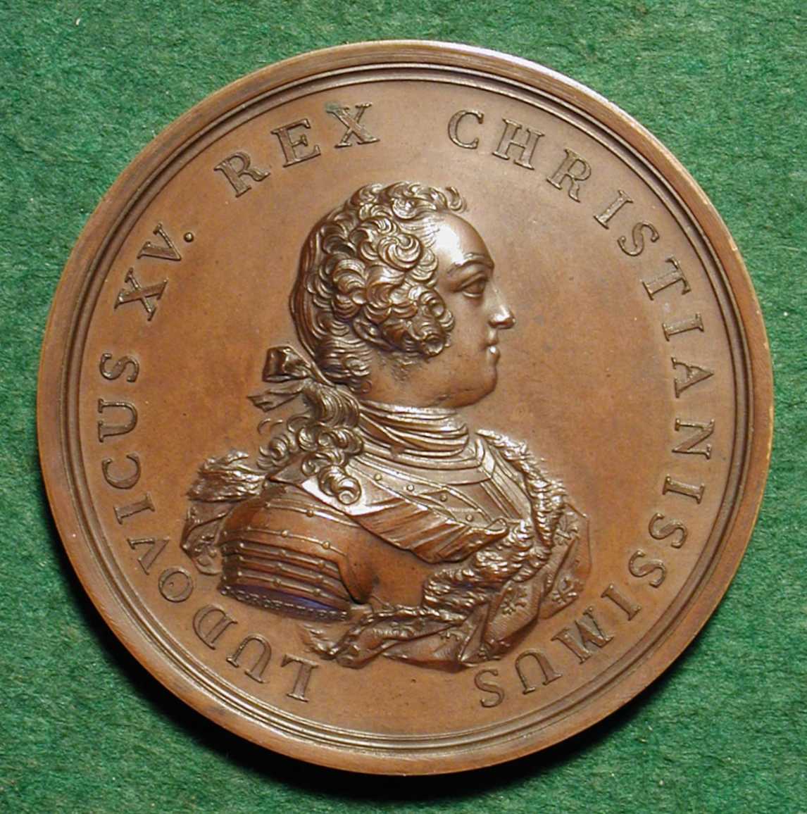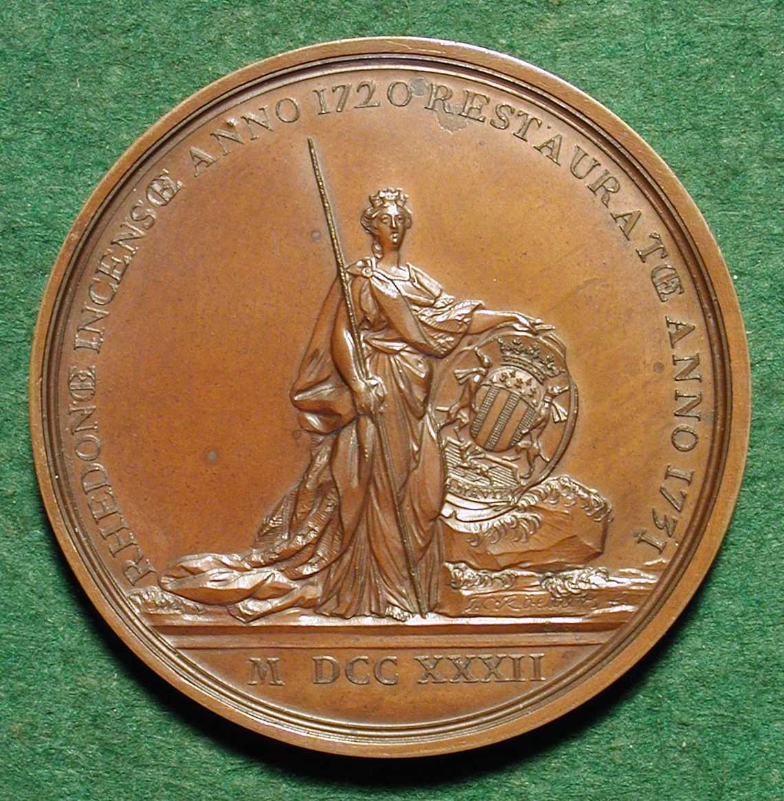 DESTRUCTION AND RESTORATION OF THE CITY OF RENNES ROETTIERS, Joseph Charles: France, 1732, Bronze, 59 mm Rennes (formerly called Condate) is a town in western France, formerly the capital of Brittany. It is the chief city of the Redones. In Roman times it was in Lugdunensis Tertia and became the center of Roman roads. Later Rennes was notable as the site at which the dukes were crowned; before entering the city they had to swear to preserve the privileges of the church, the nobles and the commons of Brittany. The town was destroyed after seven days of fire in 1720 and was for the most part rebuilt of dark granite. It is this destruction and restoration of Rennes that the medal commemorates. The medal is struck in two halves, joined together at the rim.