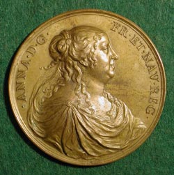 Rev: A gnomon on a pedestal bearing Anne's coat of arms, in a landscape.