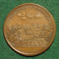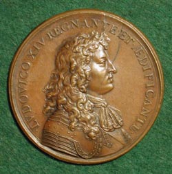 Bronze, 51 mm In 1667 Louis invaded the Spanish Netherlands, precipitating the War of Devolution (1667-1668), which ended with France gaining Franche-Compte, Lorraine, and parts of Flanders. Perhaps this medal refers to this event. LINK to War of Devolution (from World History at KMLA) For a brief biography of Louis XIV see Louis XIV: JUSTICE |
