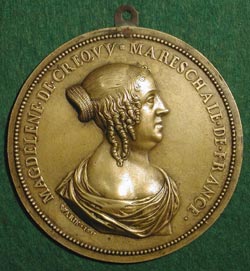 MADELEINE DE CREQUY, MARESCHALE DE FRANCE WARIN, Claude: France, 1651, Bronze, 103 mm Madeleine de Crequy (1609-1675), grand-daughter of the Mareschal de Lesdiguieres, and daughter of Charles and Madeleine de Bonne, married Nicolas de Neufville, Mareschal de Villeroy in 1617. (Jones) CREQUY, a French family which originated in Picardy, took its name from a small lordship in the present Pas-de-Calais. Its genealogy goes back to the 10th century, and from it originated the noble houses of Blécourt, Canaples, Heilly and Royon. Henri de Créquy was killed at the siege of Damietta in 1240; Jacques de Créquy, marshal of Guienne, was killed at Agincourt with his brothers Jean and Raoul; Jean de Créquy, lord of Canaples, was in the Burgundian service, and took part in the defense of Paris against Joan of Arc in 1429, received the order of the Golden Fleece in 1431, and was ambassador to Aragon and France; Antoine de Créquy was one of the boldest captains of Francis I., and died in consequence of an accident at the siege of Hesdin in 1523. Jean VIII., sire de Créquy, prince de Poix, seigneur de Canaples (d. 1555), left three sons, the eldest of whom, Antoine de Créquy (1535—1574), inherited the family estates on the death of his brothers at St Quentin in 1557. He was raised to the cardinalate, and his nephew, and heir, Antoine de Blanchefort, assumed the name and arms of Créquy. Charles I de Blanchefort, marquis de Créquy, prince de Poix, duc de Lesdiguiêres (1578—1638), marshal of France, son of Antoine de Blanchefort, saw his first fighting before Laon in 1594, and was wounded at the capture of Saint Jean d’Angély in 1621. In the next year he became a marshal of France. He served through the Piedmontese campaign in aid of Savoy in 1624 as second in command to the constable, François de Bonne, duc de Lesdiguiêres, whose daughter Madeleine he had married in 1595. (from Encyclopedia.org). Charles I de Blanchefort and Madeleine de Bonne were the parents of Madeleine de Crequy, the subject of this medal. |
