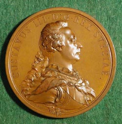 MEMORIAL MEDAL OF GUSTAVUS III OF SWEDEN KüCHLER, Conrad Heinrich: Sweden, 1793, Bronze, 56 mm Gustavus III (1746-1792) was the King of Sweden from 1771 until his death. He was the eldest son of Adolf Frederick, King of Sweden, and Louisa Ulrika of Prussia, sister of Frederick the Great. In 1766, Gustavus married Sophie Magdalen, daughter of Frederick V of Denmark. Gustavus was a poet, dramatist and patron of the arts. He was assassinated by conspiring nobles at a masquerade in Stockholm in 1792, an event which inspired Verdi's opera Un Ballo in Maschera. The medal was executed in 1793, about a year after his death. LINK to Biography of Gustavus III (from Wikipedia) |