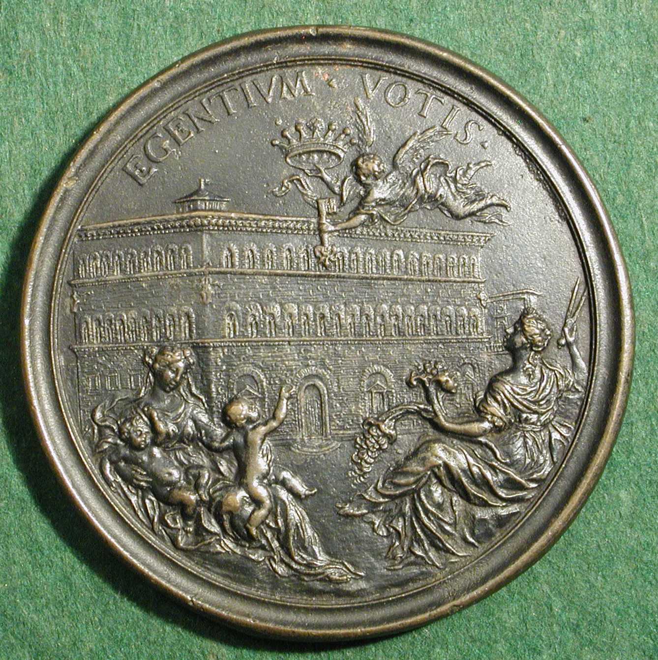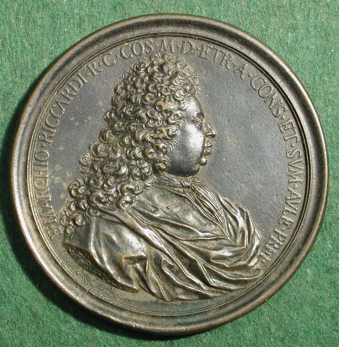 FRANCESCO RICCARDI FORTINI, Gioacchino: Italy, 1715, Bronze (cast), 88 mm The marchese Francesco Riccardi (1648-1719) was a descendant of a family of merchants who arrived from Cologne in 1300, and who purchased the Medici Palace (now the Medici-Riccardi palace) in Florence in 1659. A very rich man, he became major-domo to Cosimo III. The reverse of the medal shows and commemorates the new appearance of the palace in 1715 after its was remodeled and enlarged under Francesco Riccardi. |
