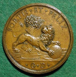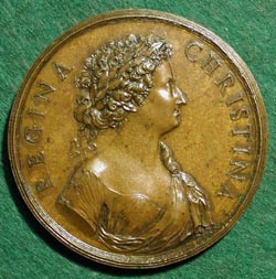 63 mm Christina Wasa (1626-1689), Queen of Sweden (1644-1654), was born in Sweden to King Gustavus II Adolfus and Maria Eleonora. She abdicated her throne and spent the major portion of the rest of her life in Rome. This is one of several medals of Queen Christina which were struck from dies executed by Guglielmada based on medals originally cast by Soldani-Benzi. |