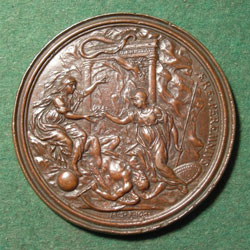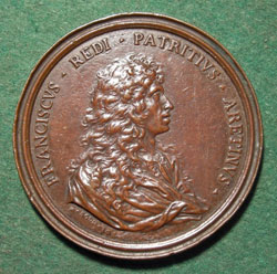 86 mm Francesco Redi (1626-1697) was born in Arezzo, Italy, the son of a renowned physician of the Medici court. In 1647 Redi earned a doctorate in philosophy and medicine from the University of Pisa. Like his father before him, in 1660 Redi was appointed to the Medici court where he was court physician, serving two successive Grand Dukes, Ferdinando II and Cosimo III. He was also their friend and counselor and tutor to the crown prince Ferdinando, the son of Cosimo III. Redi was a man of many talents. In the scientific field, he studied Zoology, Embryology, Entomology, Microscopy, Anatomy and Physiology. His masterpiece is considered to be the publication, Esperienze Introrno Alla Generazione Degli Insetti , in which he disproved the doctrine of spontaneous generation in insects. Redi was also a leading literary figure and poet, and from 1665 he occupied the chair of Tuscan language in the Florentine Academy. Also noteworthy are his published correspondences, which include those to the Italian physician and anatomist Lorenzo Bellini, the poet and mathematician Tomaso Ceva, and the Florentine librarian Antonio Magliabecchi. This is one of a group of three medals, having a similar obverse, that the grand duke commissioned from Soldani in 1684 and 1685 to celebrate Francesco Redi as poet, philosopher and scientist. |