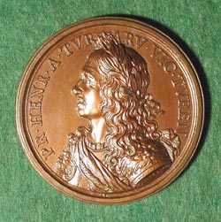 HENRY DE LA TOUR D'AUVERGNE, VICOMTE DE TURENNE HAMERANI, Giovanni: France, ca.1675, Bronze, 51 mm Henri de La Tour of Auvergne, Prince Viscount of Turenne (1611-1675), was Marshall of France and one of the greatest French commanders. The second son of Henri, duc de Bouillon, and his second wife Elizabeth, he was brought up as a Protestant, but late in his life (1668) was converted to Roman Catholicism. He began his military career in the Dutch army, serving in the Dutch war of independence (1625-1630) but soon entered French service, participating in The Thirty Years War. (The Thirty Years War was a complex series of conflicts fought mainly in Germany, arising out of the aspiration of Catholic and Protestant factions and developing into a wider, dynastic struggle for power in Europe. At its end Ferdinand and the Habsburgs lost control of Germany, Sweden was established as the dominant state in northern Europe while France replaced Spain as the greatest European power). Turenne showed his great capabilities in the Thirty Years War, distinguishing himself under Bernhard of Saxe-Weimar in the victory over the imperial forces at Breisach in 1638. In the successful battles of Freiburg im Breisgau (1644) and Noerdlingen (1645) he served with the brilliant commander Louis II de Bourbon, prince de Condé. Turenne, who had been made a marshal in 1643, was—with the Swede Lennart Torstensson—the dominant figure in the last years of the war. His series of victories expedited the long negotiations leading to the Peace of Westphalia (1648). In the third of the Dutch Wars he marched with King Louis XIV and Condé into Holland, but in1672 the French were checked before Amsterdam by the opening of the dikes. On the Rhine, Turenne defeated enemy troops at Sinzheim and ravaged the Palatinate in 1674, but in 1675 he was killed in battle against the troops of Raimondo Montecucculi. His emphasis on mobility and surprise and his patient calculation, matched by his personal courage and his popularity with his men, made him one of the important military figures of the period. (The Columbia Encyclopedia, 2001). LINK to Biography of Henri de La Tour (from fortunecity.com) |