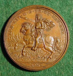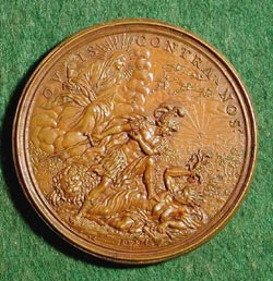 LOUIS XIV: MASSACRE OF THE HUGUENOTS IN THE CEVENNES HAMERANI, Giovanni: France, 1673, Bronze, 45 mm The Huguenots, the name given to the French Protestants who arose in France during the Reformation, suffered severe persecution by the Roman Catholic clergy. Henry IV, although adopting the Roman Catholic faith, issued the Edict of Nantes (1598), which, while recognizing Catholicism as the official religion, gave Huguenots certain rights, among them freedom of worship. Under Louis XIV, however, the clergy regained its influence and the Huguenots were again persecuted. Hundreds of proclamations, edicts, and declarations attacking the Huguenots in their household, their property and their liberty of conscience were promulgated during these years, leading finally to the total revocation of the Edict of Nantes in 1685. This caused thousands of Huguenots to flee France and greatly weakened France's Protestant alliances in Europe. This medal commemorates the massacre of the Huguenots in the Cevennes, one of the persecutions directed by Louis XIV against the Protestants during this period. It was executed in Rome by the Italian medallist Giovanni Hamerani and appears to celebrate rather than criticize this massacre, with Religion guiding the slaughter. The Cevennes are a mountain range in southern France, home to the Camisards, the name given to the Protestant peasantry who, from 1702 to 1705 and for several years afterward, carried out organized military resistance to the revocation of the Edict of Nantes. Although they killed many Catholics and burned several churches, ultimately Louis prevailed over them. It wasn't until 1789 that the Protestants' civil rights were restored and their religious equality guaranteed.