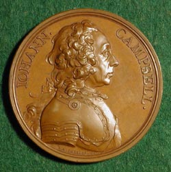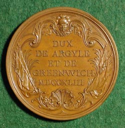 JOHN CAMPBELL, DUKE OF ARGYLE DASSIER, Jacques-Antoine: England, 1743, Bronze, 55 mm John Campbell (1678-1743), second Duke of Argyle, general and statesman, took an important part in military and political affairs during the reign of Anne, and had a principal share in bringing about the Act of Union. Under the military leadership of Charles, Duke of Marlborough, Campbell distinguished himself in several battles, including those at Ramillies, Oudenarde, Lille, Ghent and Malplaquet. In 1715 he successfully quelled the Jacobite rebellion and subsequently was given the title of Duke of Greenwich.(Thompson) |