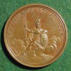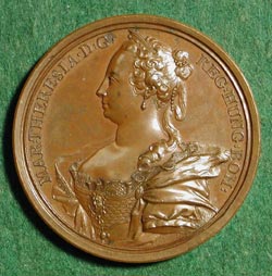 QUEEN MARIA THERESA - TREATY OF FUESSEN DASSIER, Jean: Holy Roman Empire, 1745, Bronze, 54 mm Maria Theresa (1717-1780), archduchess of Austria, Queen of Hungary and Bohemia and wife of the Holy Roman emperor Francis I was the eldest daughter of the Emperor Charles VI and Elizabeth of Brunswick-Wolfenbuettel. In 1736 she married her cousin, Francis, Duke of Lorraine, who became Grand Duke of Tuscany in 1737 and Holy Roman Emperor in 1745. His election as Holy Roman Emperor was Austria's main incentive to sign the treaty of Fuessen (www.zum.de/whkmla/), the event commemorated by this medal. From 1740, the date of her father's death, until her own death in 1780, Maria Theresa was the one of the central figures in the wars and politics of Europe. She worked assiduously to promote prosperity for her people and to give unity to an administration made up of many states and races with different characters and constitutions. The Peace of Fuessen was an important part of the War of the Austrian Succession (1740-1748), where counterclaims of the succession of Maria Theresa to the Habsburg land of her father Charles VI were challenged by Philip V of Spain, Augustus III of Poland and Charles Albert, Elector of Bavaria. At the start of the war, Frederick II of Prussia occupied the Habsburg province of Silesia. As part of the Peace of Fuessen (1745), Austria recognized Prussia's claim to Silesia in return for Frederick's support of the candidacy of Maria Theresa's husband as Emperor Francis I. The war formally ended with the Treaty of Aix-La-Chapelle (1748). |