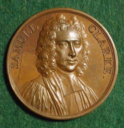 SAMUEL CLARKE DASSIER, Jean: England, ca.1733, Bronze, 43 mm Dr. Samuel Clarke (1675-1729) was a theologian, mathematician and philosopher. He was educated at Caius college, Cambridge, where the philosophy of Descartes was the reigning system. Clarke, however, mastered the new system of Isaac Newton, whose views he helped spread. He chose to ground his opinions upon the result of his own researches, and, entering deeply into the study of religion and natural philosophy, to proceed in the path in which, he thought, the Truth called him to walk. In a lecture, published as A Demonstration of the Being and Attributes of God, Clarke attempted to prove the existence of God by a method "as near to mathematical as the nature of such a discourse would allow". In another on A Discourse Concerning the Unchangeable Obligation of Natural Religion, he argued that the principles of morality are as certain as the propositions of mathematics and thus can be known by reason unassisted by faith. These and similar views spurred vehement controversy among his fellow theologians.(Eisler) LINK to Biography of Samuel Clark (from Wikipedia) |