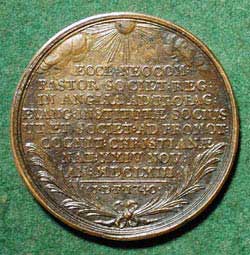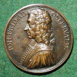John Frederick Ostervald (1663-1747), a Christian teacher and author, was born at Neufchatel, Switzerland. He was pastor at the Reformed Church at Geneva from 1699 until his death. He was the author of many religious treatises, but his greatest and most important work was his translation of the Bible. His writings were translated into English, some of which were printed at the expense of the Society for the Propagation of the Gospel. (Med. Ill.) This medal commemorates him and his works. According to Stacks, the medal has grainy surfaces from faulty planchet production as is typical. |