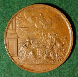 Bronze, 68 mm Catherine the Great (1729-1796) was born in Poland. In 1744 she went to Russia at the invitation of Empress Elizabeta Petrovna as the bride of the heir to the throne, Peter Feodorovich, whom she married in 1745. In 1762, with the support of the Imperial Guard, she overthrew her husband Tzar Peter III and was crowned Empress of all Russia, the event commemorated by this medal. Catherine undertook a wide range of social reforms, although after the Peasant's Revolt she became increasingly conservative and extended the powers of the nobility at the expense of the serfs. In the foreign policy arena, she waged two successful wars against the Ottoman Empire and occupied vast territories on Russia's southern boundaries. The Partitions of Poland led to the division of that country into Russia, Prussia and Austria. Russia emerged from the Russo-Turkish War (1768-1774) as the dominant power in the Middle East. Crimea was annexed in 1783 and Alaska was colonized. Catherine's dialogue with Enlightenment figures such as Voltaire did much to promote her contemporary image in Europe. She and was buried in the Cathedral of St. Peter and St. Paul Fortress in St. Petersburg. LINK to the Russo-Turkish War (from Columbia Encyclopedia) LINK to Portrait of Catherine II the Great by Alexsey Antropov (from Olga's Gallery) LINK to Collection of Medals from Imperial Russia (Yale University) |
