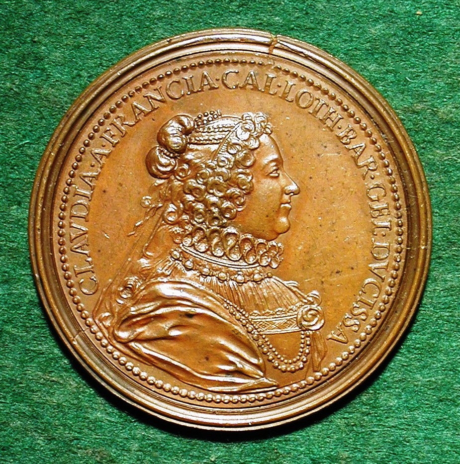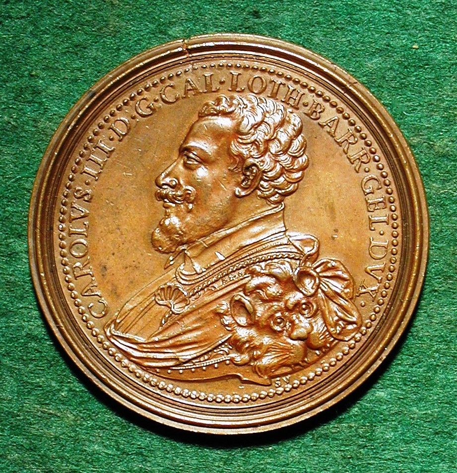 Bronze, 48 mm Charles III (1543-1608), called The Great, Duke of Lorraine from 1545 until his death in 1608, was a son of Duke Francis I and a descendant of René of Anjou. He was born in Nancy and was brought up at the court of Henry II of France. In 1559 Charles married Claude of Valois, Princess of France, daughter of King Henry II and Catherine de Medici. The union of this couple, Charles III, Duke of Lorraine, and Claudia of France, Duchess of Lorraine, is commemorated by this medal. Charles took part in the wars of religion in France and was a member of the Holy league. The duke was an excellent ruler of Lorraine. He had three sons: Henry and Francis, who became in turn dukes of Lorraine, and Charles, bishop of Metz and Strasbourg. His daughter, Elisabeth Renata, married Maximilian I, Elector of Bavaria. LINK to copper engraving of Charles III, Duc de Lorraine by Domicius Custos (from thepeerage.com) LINK to Dukes and Duchesses of Lorraine Family Tree (from wikipedia.com) |