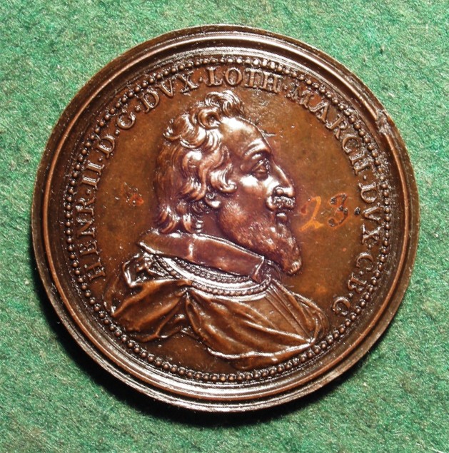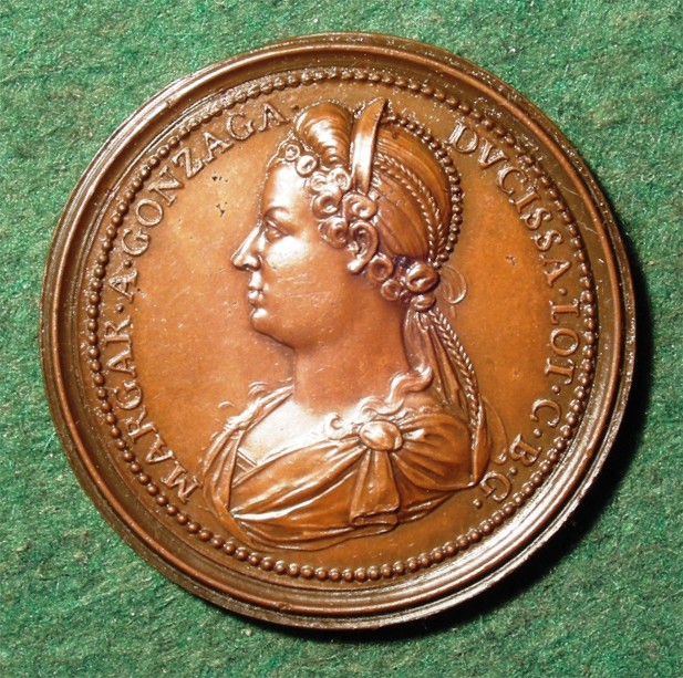 HENRY II OF LORRAINE AND MARGUERITE OF GONZAGA ST. URBAIN, Ferdinand de: Lorraine, ca. 1720, Bronze, 47 mm Henry (Henri) II, Duc de Lorraine (le Bon) (1563-1624) was the son of Charles III, Duc de Lorraine and Claude de Valois, Princesse de France. In 1599 he married his first wife, Catalina de Bourbon, Princesse de Navarre, daughter of Antoine, Rey de Navarre and Jeanne III, Reina de Navarre. In 1606 he married his second wife, Margherita Gonzaga. Henry, succeeded to the title of Duc de Lorraine in 1608 at the age of 45. However, as he had relatively little political experience, he came under the influence of others, the most prominent being Henry Ancerville, son of the Cardinal de Guise. Henry’s strong religious ties led to his becoming an ardent defender of the Counter-Reformation and encouraged him to issue several edicts ordering Protestants to leave Lorraine. Nevertheless, during the Thirty Years War, a wide ranging conflict fought largely between the Protestant and Catholic countries of Europe, Henry kept a neutral position and tried to play the role of conciliator among the warring parties. Margherita Gonzaga (1591-1632) was the daughter of Vincenzo I Gonzaga, 4th Duca di Mantova and Eleonora de Medici. The children of Henri and Margherita were Nicolaea, Duchesse de Lorraine and Claude de Lorraine. LINK to Image of Henri II, Duc de Lorraine (from wikipedia) LINK to Dukes and Duchesses of Lorraine Family Tree (from wikipedia.com) |