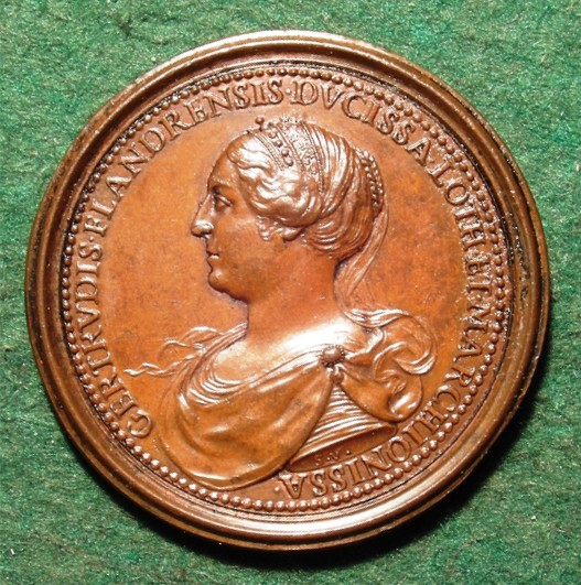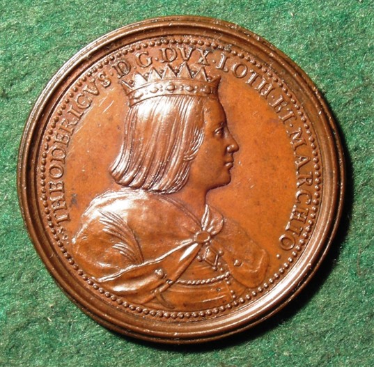 THIERRY II D’ALSACE AND GERTRUDE OF FLANDERS ST. URBAIN, Ferdinand de: Lorraine, ca. 1720, Bronze, 47 mm Thierry II (Theodoric II), called the Valiant, was the duke of Lorraine from 1070 to his death in 1115. He was the son and successor of Gerard (Gerhard) and Hedwige de Namur. Gertrude of Flanders (1080-1117) was the daughter of Robert I Count of Flanders and Artois. Her first marriage was to Henrich III Count of Louvain with whom she bore four daughters. Her second marriage was to duke Thierry II of Lorraine, the subject of this medal. LINK to Dukes and Duchesses of Lorraine Family Tree (from wikipedia.com) |