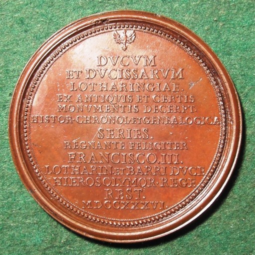 71 mm The Title Medal for the Series of the Dukes and Duchesses of Lorraine was made in 1736 by Augustin de St. Urbain, the son of Ferdinand de St. Urbain. It is the largest of the group and has on the obverse the names of all the Dukes of Lorraine with their respective coats of arms. LINK to Dukes and Duchesses of Lorraine Family Tree (from wikipedia.com)
