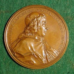 CARDINAL ULISSE GUISEPPE GOZZADINI ST.URBAIN, Ferdinand de: Italy, ca.1709, Bronze, 56 mm Ulisse Giuseppe Gozzadini (1650-1728) was born in Bologna, the grand-nephew of Cardinal Marcantonio Gozzadini. He attended the University of Bologna, was ordained to the priesthood and was Professor of law at the University of Bologna for twenty years. In 1700 he was elected titular archbishop of Teodosia. Later he was created cardinal priest and received the red hat and the title of S. Croce in Gerusalemme in 1709, the event likely commemorated by this medal. As cardinal he was transferred to the see of Imola, with the personal title of archbishop. Cardinal Gozzadini represented the pope in the wedding of King Felipe IV of Spain and Princess Isabella Farnese of Parma in 1714. He died in Imola and was buried in the cathedral of Imola. |