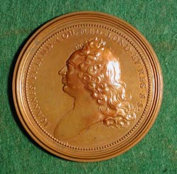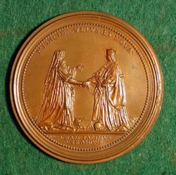 DEATH OF JOHN FREIND, PHYSICIAN ST URBAIN, Ferdinand de: England, 1728, Bronze, 57 mm John Freind, a Fellow of the Royal Society (1712) and member of Parliament for Launceston (1722), was an English physician and medical historian. He is thought to have had a hand in Atterbury's plot for the restoration of the Stuart family and was committed to the Tower. There he worked on his most elaborate work, The History of Physic from the time of Galen to the beginning of the sixteenth century. Upon his release, he was appointed physician to Frederick, Prince of Wales and later to Queen Caroline. The reverse of this medal is an allusion to the union of the old practice founded upon reasoning and the modern practice founded on experiment. The joining of the two forms an alliance between ancient and modern medicine, making them both one. |