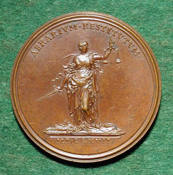 ESTABLISHMENT OF THE CHAMBER OF JUSTICE ST URBAIN, Ferdinand de: France, 1717, Bronze, 44 mm Philippe fought at Sternkerk, Neewinden and Namur. He was successful in campaigns in Italy and Spain but his suspected desire to succeed Philip V, King of Spain, gained him Louis XIV’s disfavor. In 1715 he was appointed president of the council of regency of the young King Louis XV, and on Louis XIV’s death he invested himself with absolute power. On the majority of King Louis XV in1723, he relinquished his supreme power but became first minister to the king until his death later that year. Philippe had several good qualities. He was a liberal and imaginative man and had great administrative abilities. As Regent, he changed the manners of the ruler and his nobles from the hypocrisy of Louis XIV to complete candor. On the religious front, though a professed atheist, he restored liberty to the persecuted Jansenists. He was against censorship and ordered the reprinting of books banned under the reign of his uncle. Reversing his uncle's policies again, Philippe formed an alliance with England, Austria, and the Netherlands, and fought a successful war against Spain that established the conditions of a European peace. Philippe promoted education, making the Sorbonne tuition free and opening the Royal Library to the public (1720). Unfortunately these actions were spoilt by an excessive taste for pleasure and a lack of moral restraint, marking his regency as one of the most corrupt periods in French history. He was succeeded by his only son Louis, later Duke of Orléans (1703–1752). The medal commemorates the establishment of a chamber of justice and the restoration of the public treasury during his regency. LINK to