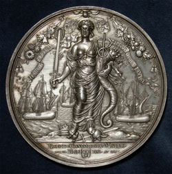 her left hand a cornucopia. She is trampling upon arms, a crown and a money