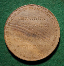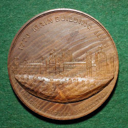 This is one of a set of several wooden medals issued on the site of the International Centennial Exhibition at Fairmount Park, Philadelphia. The set consisted of various buildings and other scenes and portraits, including one of George Washington. The medals were manufactured by the Ornamental Wood Company, Philadelphia, where they could be purchased as a souvenir of the visit. A set of six of these medals was originally in a fitted card case, with the interior lid printed with a birds eye view of the exhibition buildings.