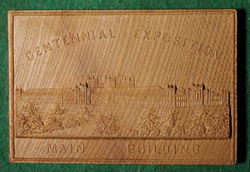 by ? : USA, 1876, Wood, 68 x101 mm Obv: Exterior view of Main Building Above: CENTENNIAL EXPOSITION Below: MAIN BUILDING Rev: blank Ref: Spangenberger-1876- 19 This is one of a set of several wooden medals issued on the site of the International Centennial Exhibition at Fairmount Park, Philadelphia. The set consisted of various buildings and other scenes and portraits, including one of George Washington. The medals were manufactured by the Ornamental Wood Company, Philadelphia, where they could be purchased as a souvenir of the visit. A set of six of these medals was originally in a fitted card case, with the interior lid printed with a birds eye view of the exhibition buildings. |