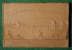 by ? : USA, 1876, Wood, 68 x101 mm Obv: Exterior view of Machinery Hall Above: CENTENNIAL EXPOSITION Below: MACHINERY HALL Rev: blank In original green cardboard box Ref: Spangenberger-1876- 18 This is one of a set of several wooden medals issued on the site of the International Centennial Exhibition at Fairmount Park, Philadelphia. The set consisted of various buildings and other scenes and portraits, including one of George Washington. The medals were manufactured by the Ornamental Wood Company, Philadelphia, where they could be purchased as a souvenir of the visit. A set of six of these medals was originally in a fitted card case, with the interior lid printed with a birds eye view of the exhibition buildings. |