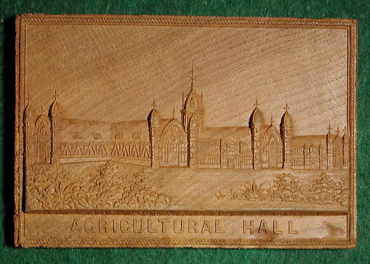 1876 CENTENNIAL- AGRICULTURAL HALL Ornamental Wood Company: USA, 1876, Wood, 68 x101 mm This is one of a set of several wooden medals issued on the site of the
