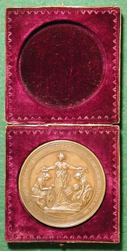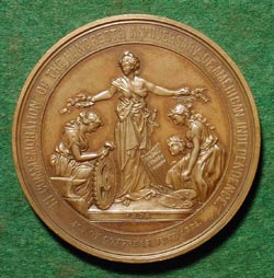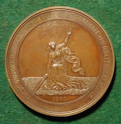AMERICAN INDEPENDENCE CENTENNIAL BARBER, William: USA, 1876, Bronze, 57 mm This medal, which is one of the official medals of the 1876 centennial celebration, was authorized by an Act of Congress in 1874. "Be it enacted by the Senate and House of Representatives of the United Stated in Congress assembled: That medals with appropriate devices, emblems and inscriptions, commemorative of the Centennial Anniversary of the Declaration of Independence, be prepared at the mint at Philadelphia for the Centennial Board of Finance...". These official medals were of four kinds: small gilt (38 mm), large bronze (57 mm), coin silver, and large gilt. Some (such as this example) were enclosed in a case. (Loubat) LINK to text of DECLARATION OF INDEPENDENCE (from Indiana University School of Law) LINK to the American Revolution (from The History Place) |