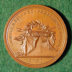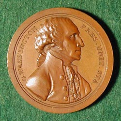 SANSOM'S PRESIDENCY RELINQUISHED MEDAL REICH, John: USA, 1797 , Bronze, 40 mm John Sansom was a member of a wealthy, influential Philadelphia family who decided to commemorate the American Revolution with a series of medals of his own design. This bust of George Washington is from a drawing by Gilbert Stuart "sketched on purpose". The original dies were struck in the early 1800s. This specimen was one of 308 medals likely executed from dies restruck in 1859. LINK to the American Revolution (from The History Place) |