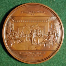 DECLARATION OF INDEPENDENCE WRIGHT, Charles Cushing: USA, ca.1880, Bronze, 93 mm This medal is the largest of the Washington series of medals and second in importance only to the Washington Before Boston medal. Baker states that the obverse bust of Washington is after Houdon and "is the best medallic portrait of Washington known to us, conveying all the truth and character of the original and is remarkable for its excellence of execution, simplicity of treatment and dignity of expression". The reverse depicts the presentation of the document to the Continental Congress by the 'Committee of Five" who drafted the Declaration of Independence. They are shown standing in front of a table behind which seats John Hancock, the President of the Continental Congress. The five standing figures represent, from left to right, John Adams, Roger Sherman, Robert R. Livingston, Thomas Jefferson, presenting the document, and Benjamin Franklin. The medal is among the rarest of Washington medals. A few exist in struck form while others, like this piece, are copper electrotypes made by George Segebaden in the late 19th century. It is believed that early in the process of striking the medals, the extremely large die broke and that electrotypes were made from the remaining struck medals. Charles Cushing Wright, the medallist, engraved the dies